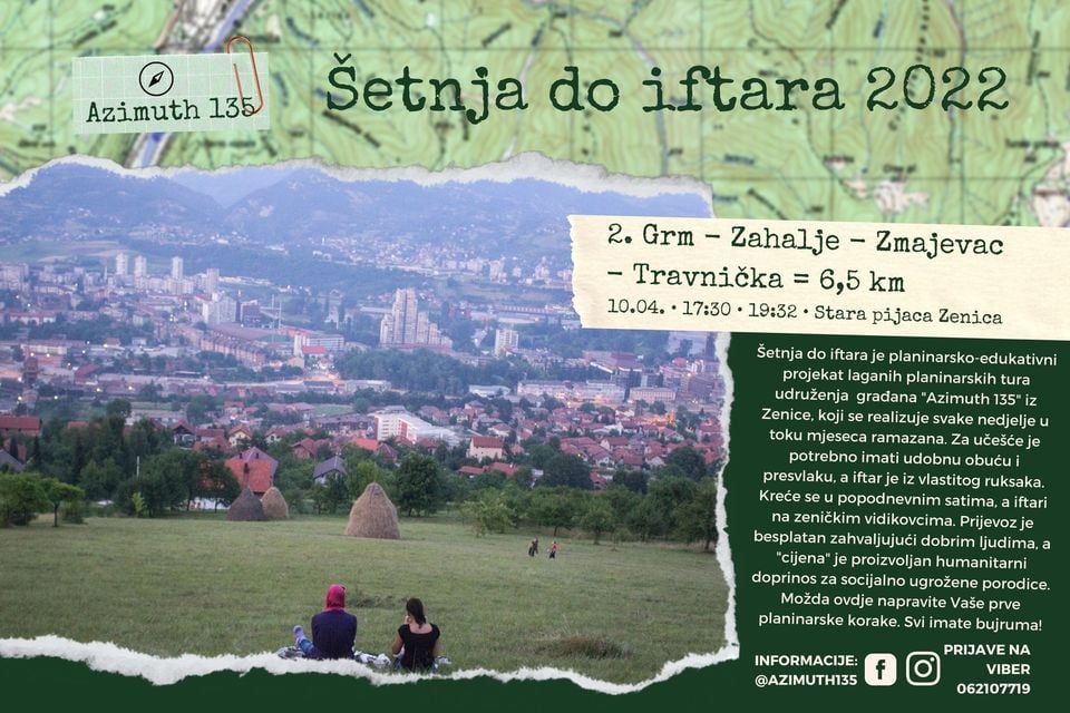 I konačno, Četvrta Šetnja, 24. aprila 2022. godine, okupila je čak 172 učesnice i učesnika, a uputili smo se sa Vjetrenica, preko Kubera, Dobriljena i Volovske Glave do Golupka iznad Krivača, u komšiluk Sportsko-rekreativnog centra “Lidio”. Prelijepo vrijeme i hodljiva tura bili su kombinacija za krunu cjelokupnog ovoramazanskog cikusa, a kao biser na toj kruni je i brojka od 1.561,45 BAM prikupljenih u humanitarnom doprinosu i uplaćenih na račun humanitarnog udruženja “Hrabro srce” iz Zenice.