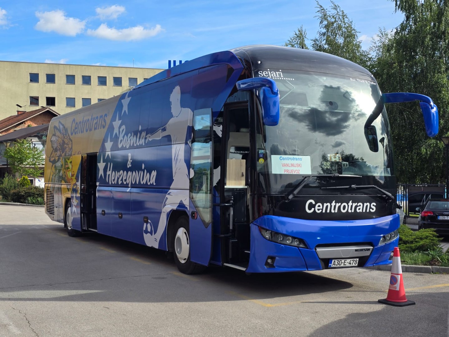 Autobus je sada u bojama zastave Bosne i Hercegovine, a na desnoj strani je iscrtan i veliki zmaj koji riga vatru. Naravno, motiv je jasan, pošto naš nacionalni tim nosi nadimak Zmajevi.
