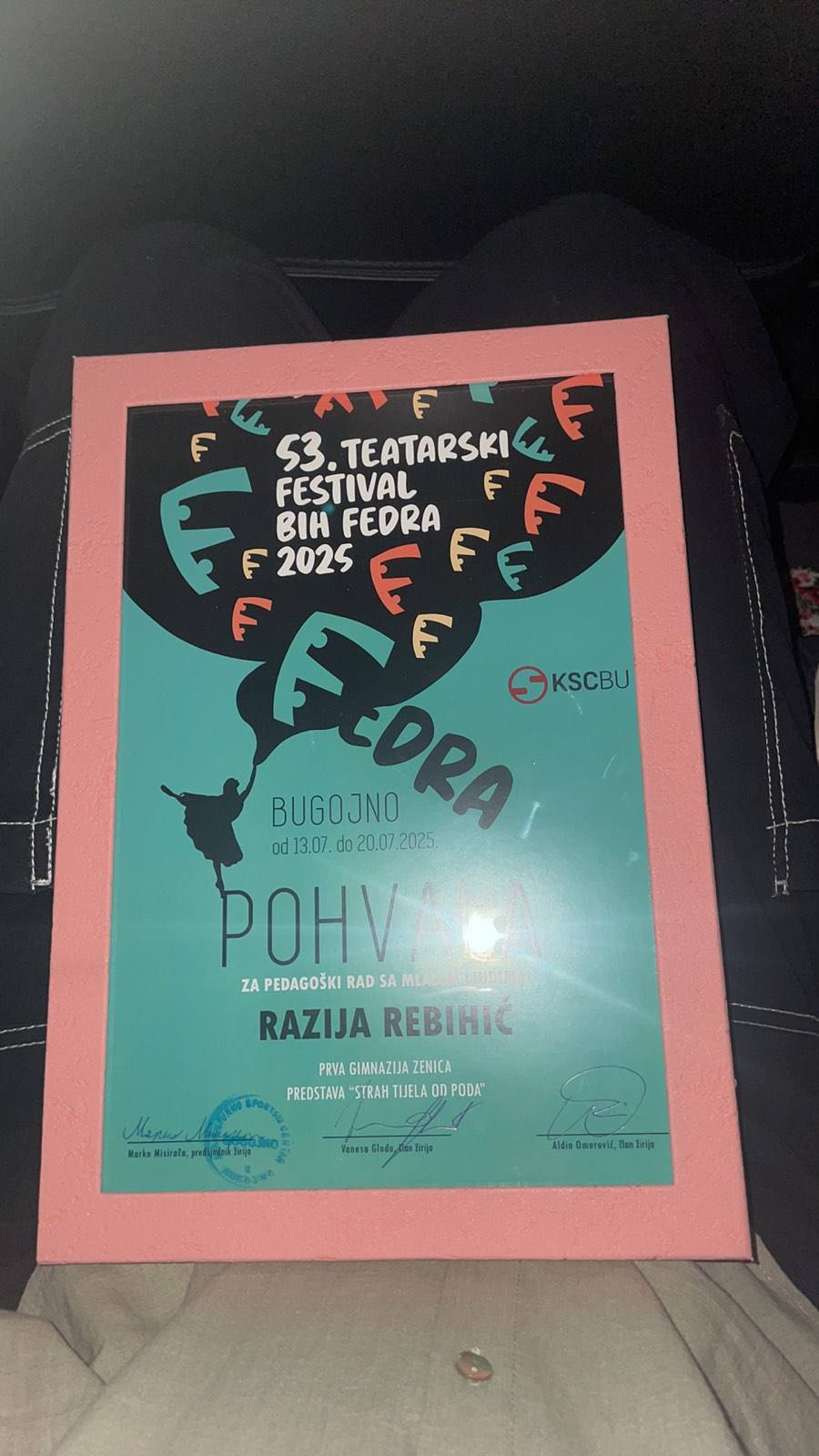Dramska sekcija Prve gimnazije iz Zenice ostvarila je izuzetan uspjeh na 53. izdanju festivala Fedra, najznačajnijem amaterskom dramskom festivalu u Bosni i Hercegovini, koji je održan u Bugojnu od 13. do 20. jula 2025. godine.