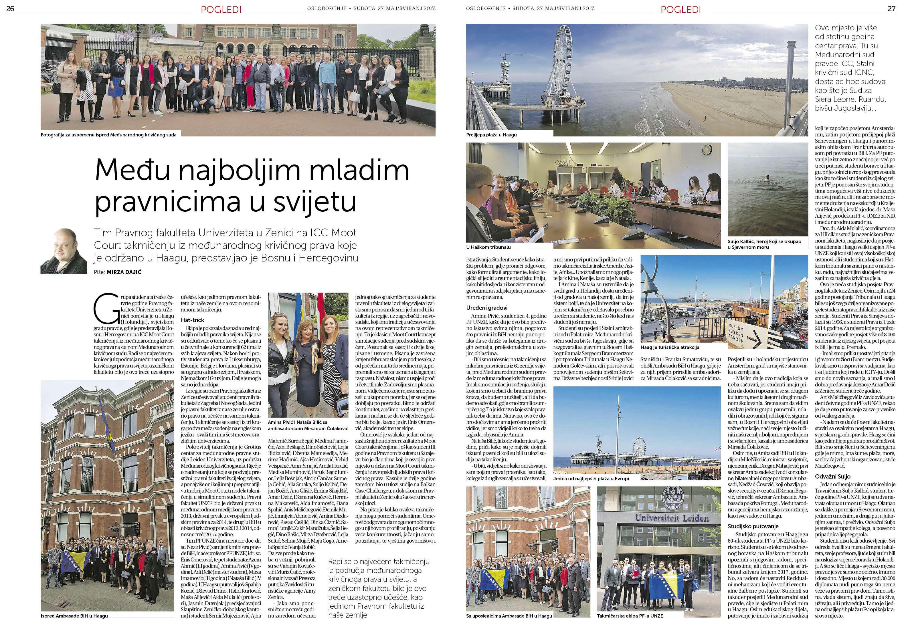 Grupa studenata treće i četvrte godine Pravnog fakulteta Univerziteta u Zenici boravila je nedavno u Haagu (Holandija), svjetskom gradu pravde i diplomatskom centru, gdje je njihova ekipa predstavljala Bosnu i Hercegovinu na ICC Moot Court takmičenju iz međunarodnog krivičnog prava na stalnome Međunarodnom krivičnom sudu. Radi se najvećem takmičenju iz područja međunarodnoga krivičnoga prava u svijetu, a zeničkom fakultetu bilo je ovo drugo uzastopno učešće, kao jedinom Pravnom fakultetu iz naše zemlje koji je ikada učestvovao na ovom renomiranom takmičenju.