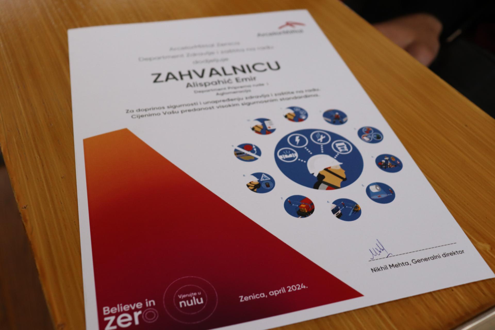 ArcelorMittal Zenica je u sedmici 22. – 26. april 2024. realizirala različite aktivnosti povodom obilježavanja Dana zdravlja i zaštite na radu 2024, a kao završna svečanost, 26. aprila 2024. održana je Ceremonija nagrađivanja za izuzetan doprinos poboljšanju performansi zaštite na radu. Osim toga, prikazan je korporativni film „Dan zdravlja i zaštite na radu 2024“, koji prenosi razumijevanja „Vjerujete u nulu“ i iskustva kolega iz različitih jedinica širom ArcelorMittala (USKORO).