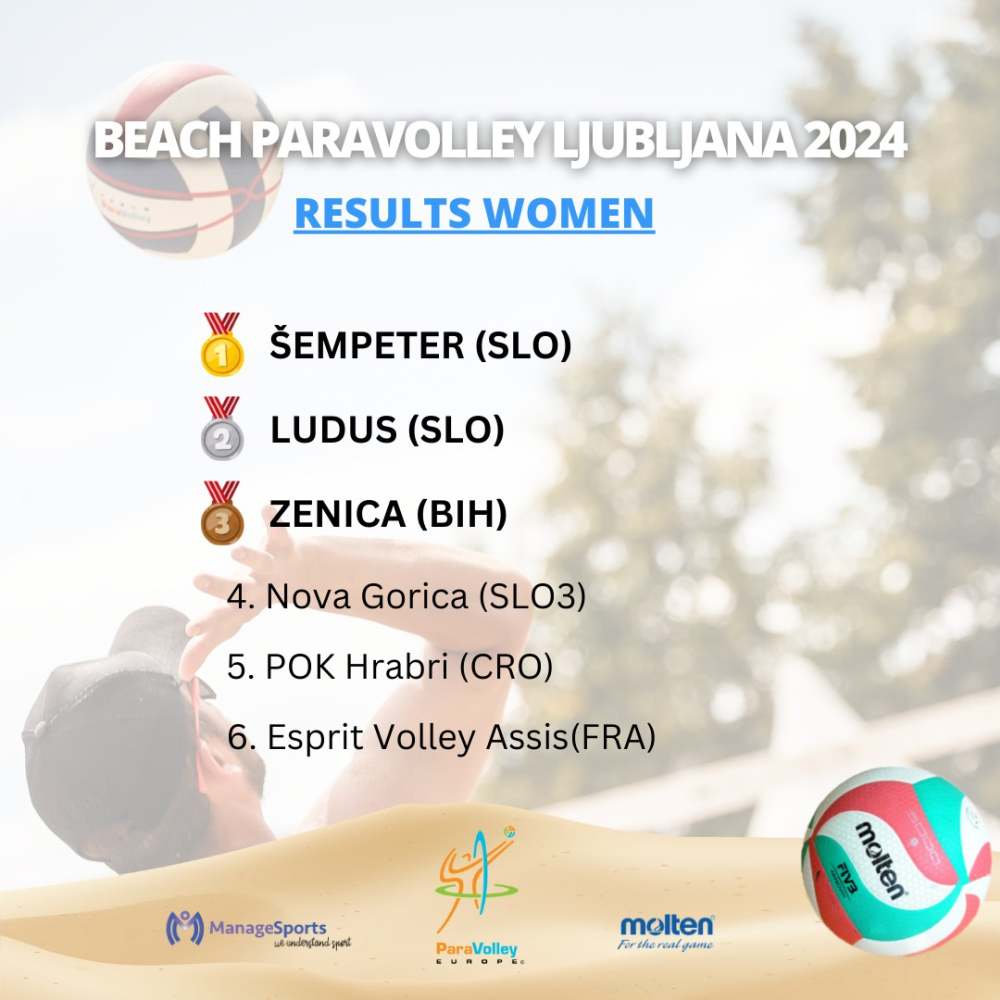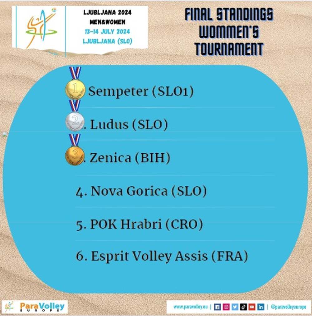 Na ovom ženskom turniru u paravolleyu na plaži učestvovalo je šest ekipa i to: Šempeter (SLO1), Ludus (SLO), ŽKSO „Bosna“ Zenica (BiH), Nova Gorica (SLO), POK Hrabri (Hrvatska) i Esprit Volley Assis (Francuska).