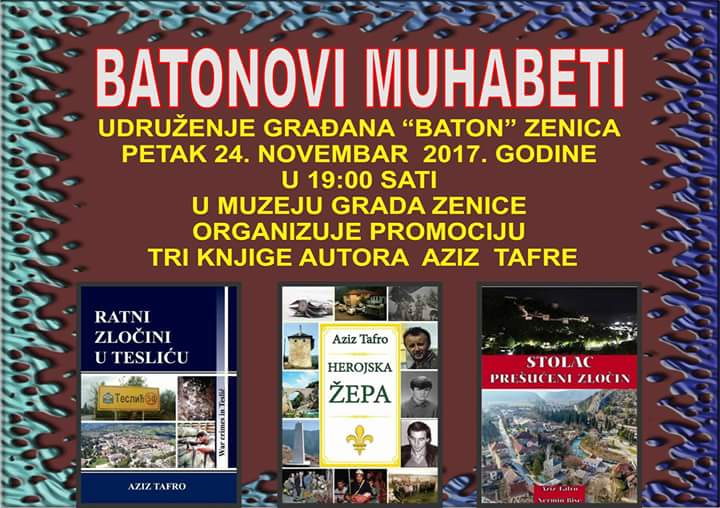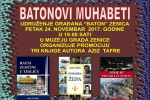 FOTO: Treći Batonovi muhabeti – promocija tri knjige autora Aziza Tafre – U sklopu Batonovih muhabeta projekta koji Udruženje građana KPS Baton Zenica realizuje sa ciljem resocijalizacije ratnih vojnih i civilnih invalida ali i svih drugih boračkih kategorija, u petak 24. novembra 2017 godine organizovana je promocija tri knjige autora Aziza Tafre iz Goražda.
