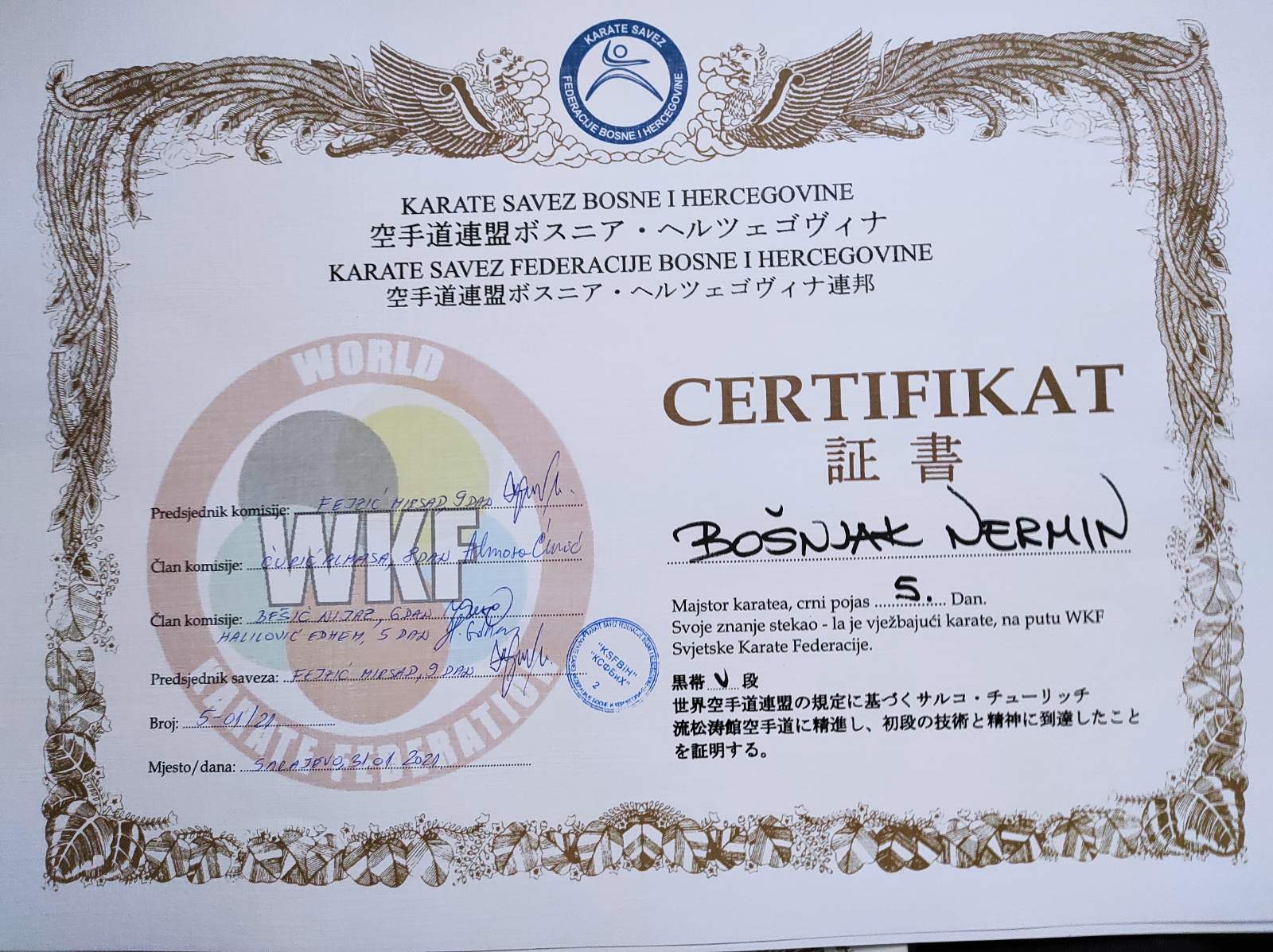 – BOŠNJAK NERMIN je USPJEŠNO POLOŽIO ZA MAJSTORSKO ZVANJE CRNI POJAS 5. DAN