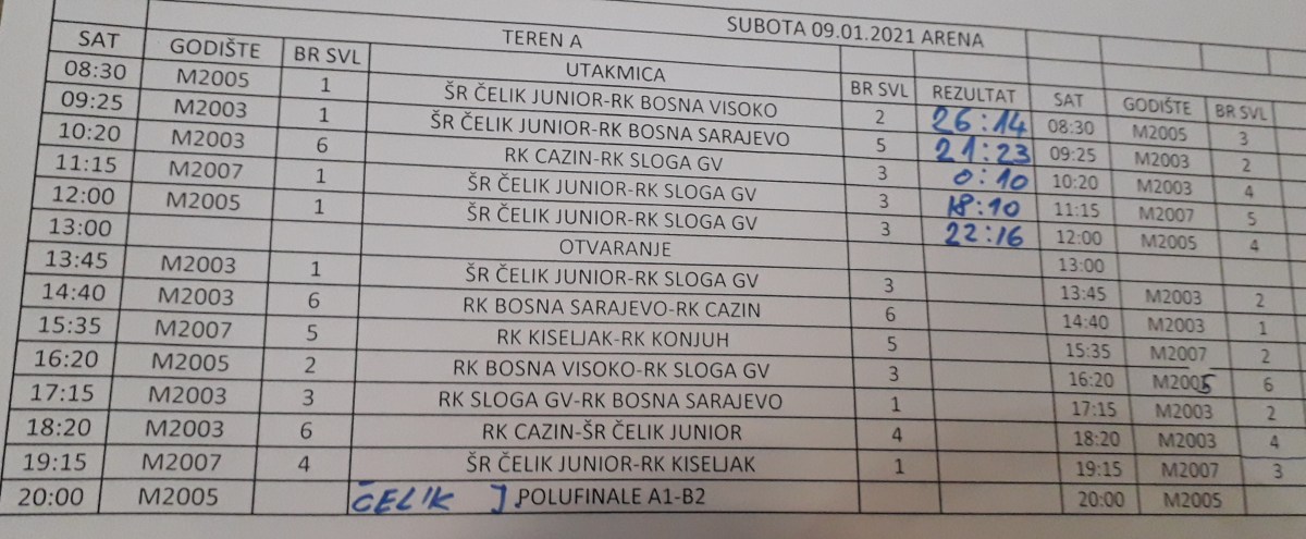Utakmice počinju oba dana u 8:30 sati na terenima A i B. Prvog dana igraju se utakmice po grupama i dva polufinala, a u nedjelju su utakmice za plasman i turnir za djevojčice. Domaćin i organizator turnira “Čelik Junior” za najbolje pojedince i ekipe pripremio je i prigodna priznanja. Donosimo vam nekoliko detalja za utakmice RK Velež – RK Čelik, kategorija 2005., koju je dobila ekipa RK Velež.