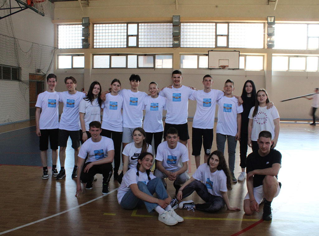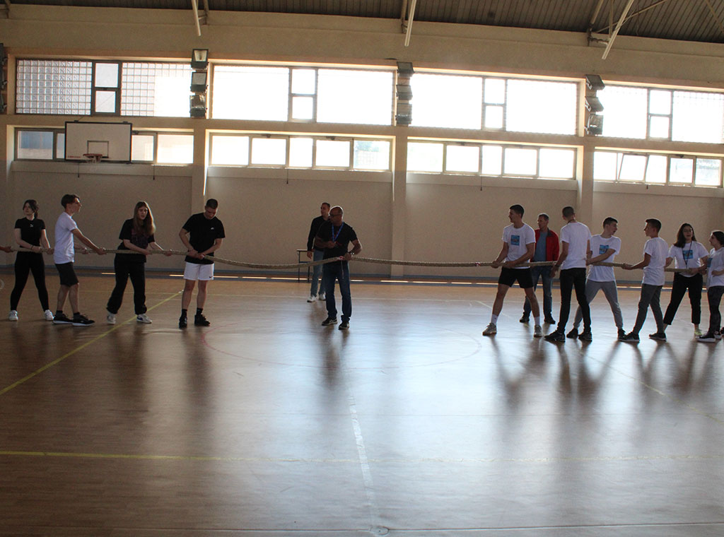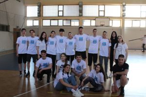 Uslijedio je sportski dio susreta, te se u dvorani odigrala odbojkaška utakmica mješovitih timova obiju škola. Posebno zanimljivo bilo je potezanje konopaca u kojem su se natjecali učenici, ali i profesori i profesorice. Učenici i profesori pokazali su ferplej igru i međusobnu prijateljsku podršku te da su, kako glasi i naziv projekta, zajedno u duhu – zajedno u sportu.