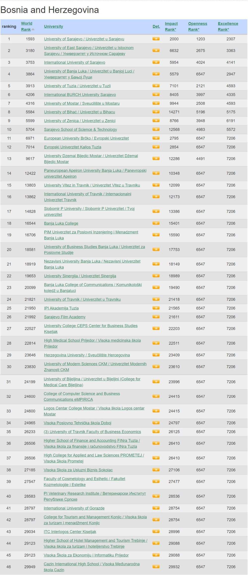 Stranica Webometrics koja se bavi rangiranjem svjetskih univerziteta izdala je januarsku listu najboljih svjetskih univerziteta. Univerziteti su rangirani prema tri kriterija: utjecaj, otvorenost i izvrsnost. Na listi je rangirano i 46 univerziteta i visokih škola iz Bosne i Hercegovine. Najbolje mjesto je zauzeo Univerzitet u Sarajevu, koji se nalazi na 1.593. mjestu najboljih univerziteta u svijetu.