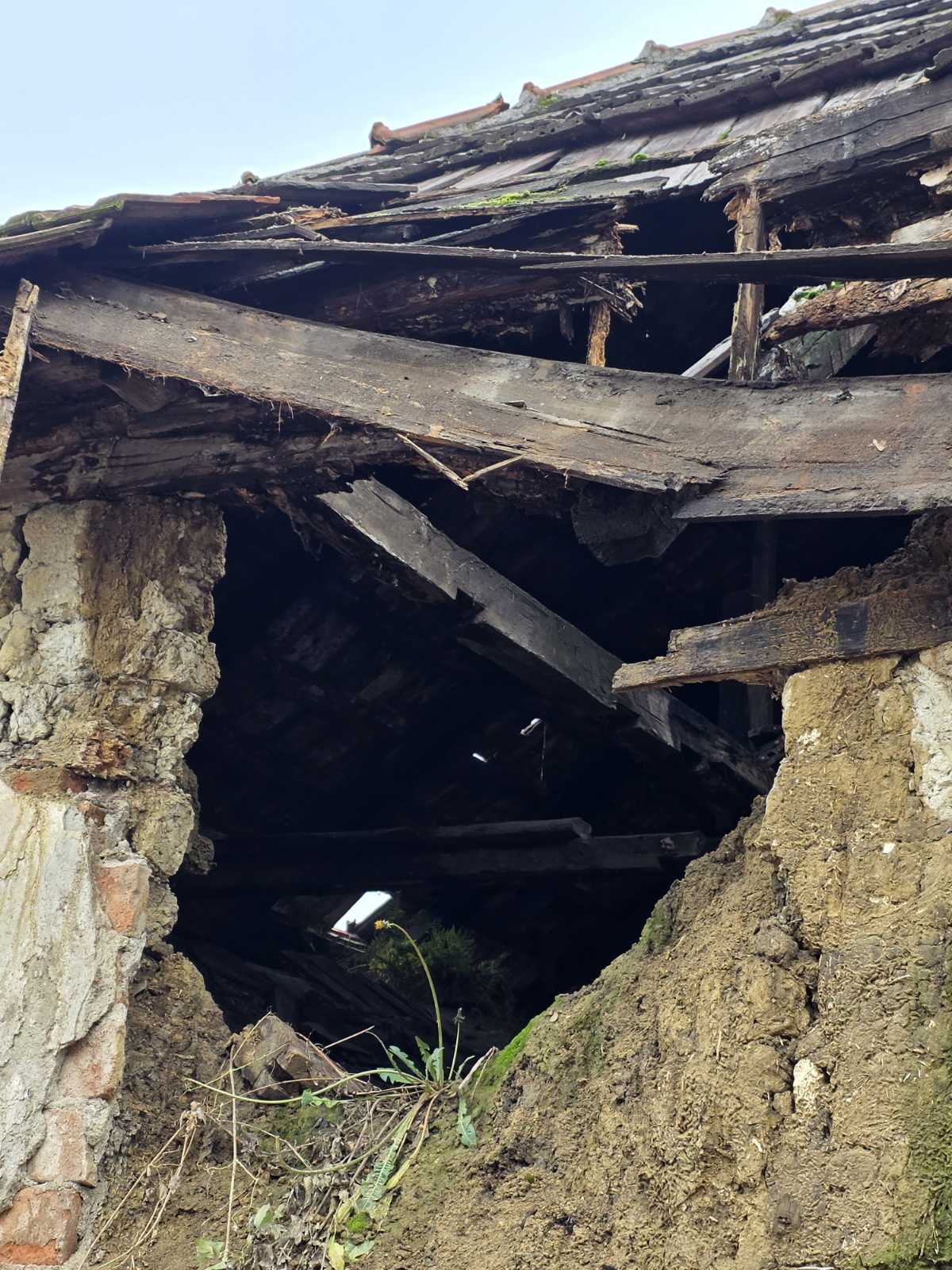Vidljivi su odronjeni dijelovi fasade, krova i materijal koji je pao, dok se ostatak objekta i dalje čini nestabilnim.