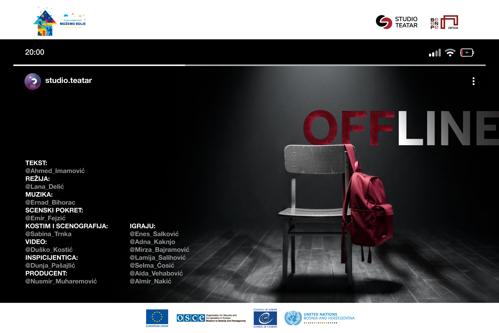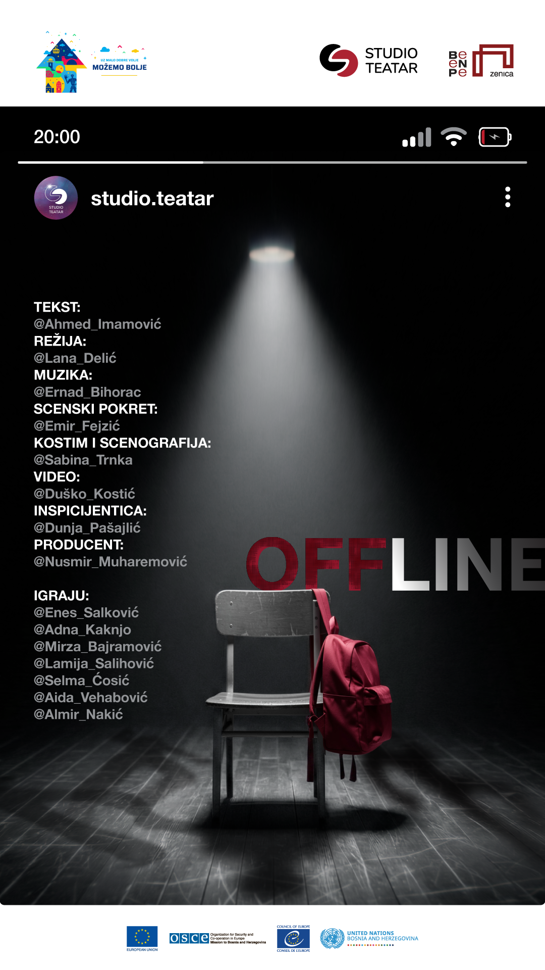 U produkciji Studio Teatra a u saradnji s Bosanskim narodnim pozorištem iz Zenice, uskoro će biti premijerno izvedena predstava „Offline“, koja već u fazi priprema izaziva veliko interesovanje publike. Premijera je planirana za 30. mart u Zenici a već u aprilu slijedi turneja u osam gradova.