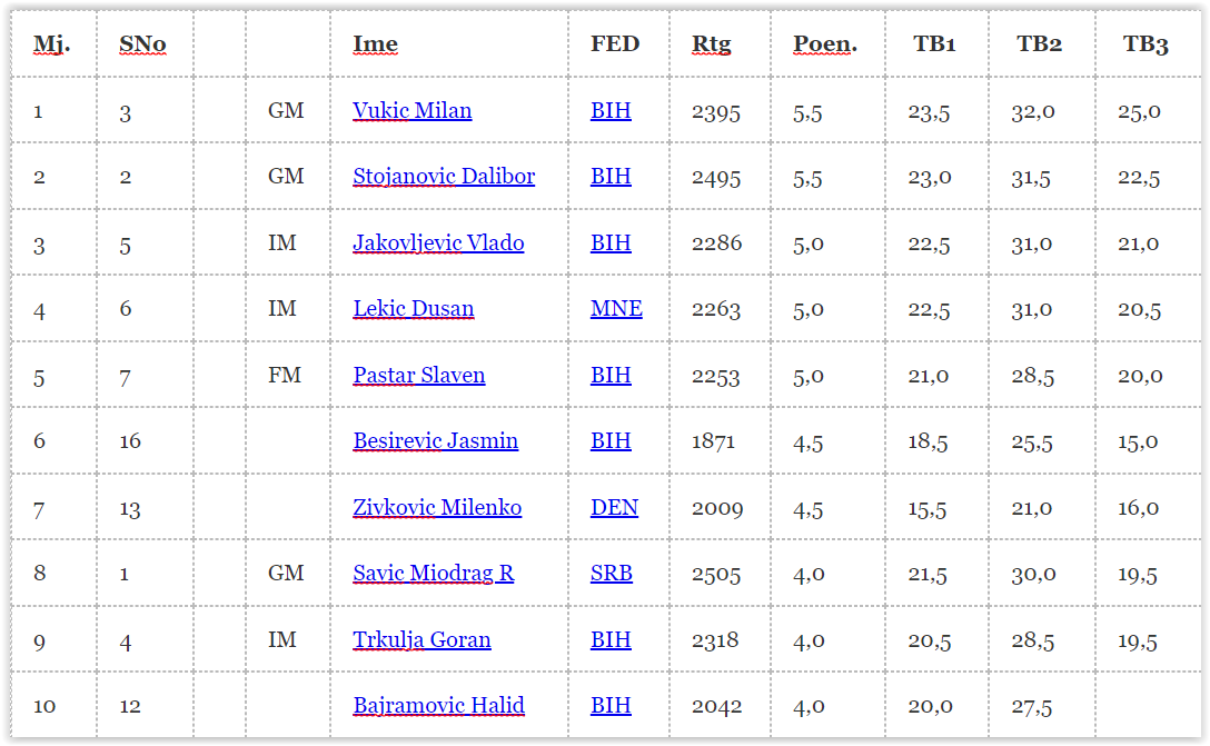 Pobjednik turnira je velemajstor (GM) Milan Vukić iz Banja Luke sa 5,5 poena, koji je odbranio titulu pobjednika od prošle godine, drugi je bio velemajstor Dalibor Stojanović, takođe, sa 5,5 poena, a treći inter majstor Vlado Jakovljević sa 5,0 poena.