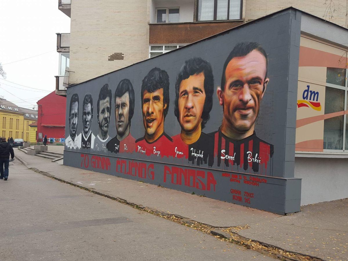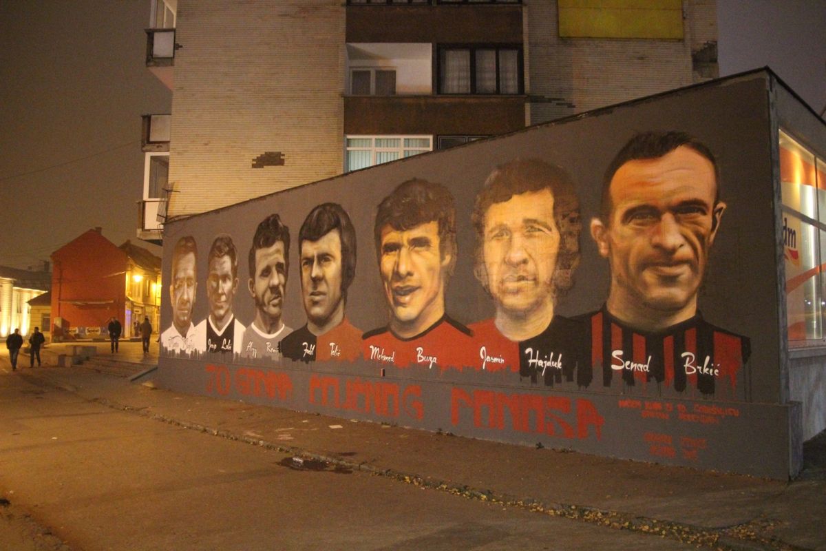 Tako su se na muralu u centru grada našla imena Mujo Mujkić, Josip Lalić, Alojz Renić, Fadil Talić, Mehmed Buza, Jasmin Hajduk i Senad Brkić. (Faktor)