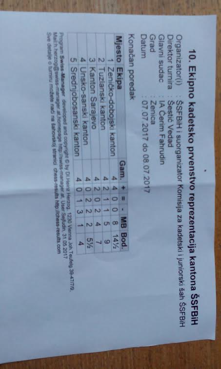 ZDK prvak kadetskog prvenstva reprezentacija kantona – U organizaciji Šahovskog saveza Federacije BiH i suorganizaciji Komisije za kadetski i juniorski šah ŠSFBiH, u Zenici je održano Deseto ekipno kadetsko prvenstvo reprezentacija kantona ŠSFBiH u šahu za 2017.godinu. Prvenstvo je igrano u J.U. „Penzionerski dom sa stacionarom“ u Zenici , u periodu od petka 07.07. do subote 08.07.2017.godine. Učešće je uzelo pet reprezentacija kantona ŠSFBiH.