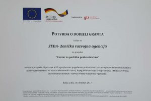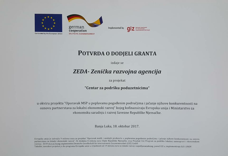 Agenciji ZEDA dodijeljen je certifikat za dodjelu grant sredstava čiji će rezultat biti “Centar za podršku poduzetnicima”. U okviru novog fokusa djelovanja Agencija ZEDA i partneri Grad Zenica i Udruženje poslodavaca Zenica, a na osnovu onoga što je definisano kroz BFC certifikaciju, će formirati “Centar za podršku poduzetnicima”