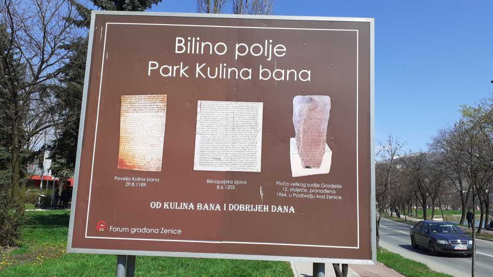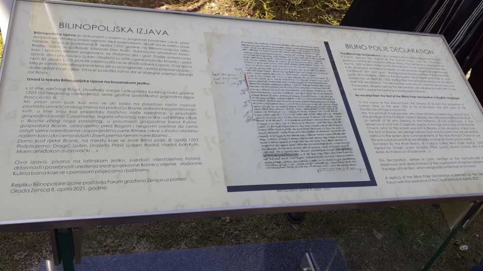 Gradonačelnik Zenice Fuad Kasumović i predsjednik Foruma građana Zenice Faruk Kadrić svečano su u Parku Kulin ban na Bilinom polju danas otkrili repliku Bilinopoljske izjave, koja je i potpisana 8. aprila 1203. godine te svjedoči o višestoljetnom kontinuitetu države Bosne i Hercegovine, ali i bogate prošlosti grada Zenica.