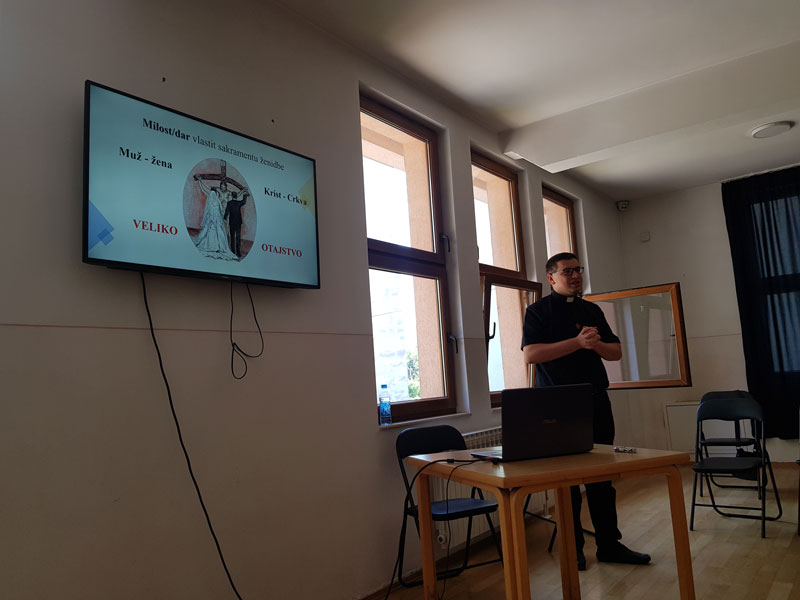 Potom je uslijedilo predavanje svećenika koji je na postdiplomskom studiju iz pastorala braka i obitelji u Rimu don Ante Vrhovca koji je govorio o poslanju bračnih supružnika, odnosno o braku kao pozivu, koje se sastoji u otkrivanju, očuvanju i komuniciranju ljubavi koju Bog ima za čovjeka i Krist za svoju Crkvu.
