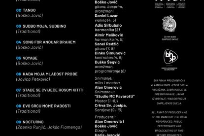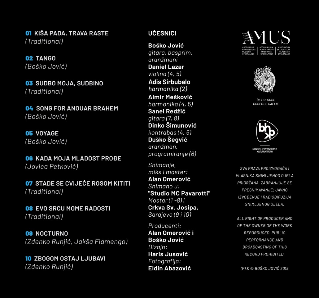 FOTO+VIDEO: Gitarista Boško Jović predstavlja video za autorsku kompoziciju Tango koju je snimio sa harmonikašem Adisom Sirbubalom Gitarista – Boško Jović objavio je svoj drugi po redu CD pod nazivom “Voyage”. Album sadrži 10 kompozicija i sniman je u MC ”Pavarotti” u Mostaru i Crkvi Sv. Josipa u Sarajevu . Kao gosti pojavljuju se renomirani muzičari: Adis Sirbubalo, Almir Mešković, Daniel Lazar, Dinko Šimunović, Sanel Redžić i Duško Šegvić. Za snimanje, mix i master zadužen je bio Alan Omerović. CD je podržan od strane Asocijacije kompozitora – muzičkih stvaralaca Amus i Bosansko Hercegovačke kulturne platforme” iz Beča.