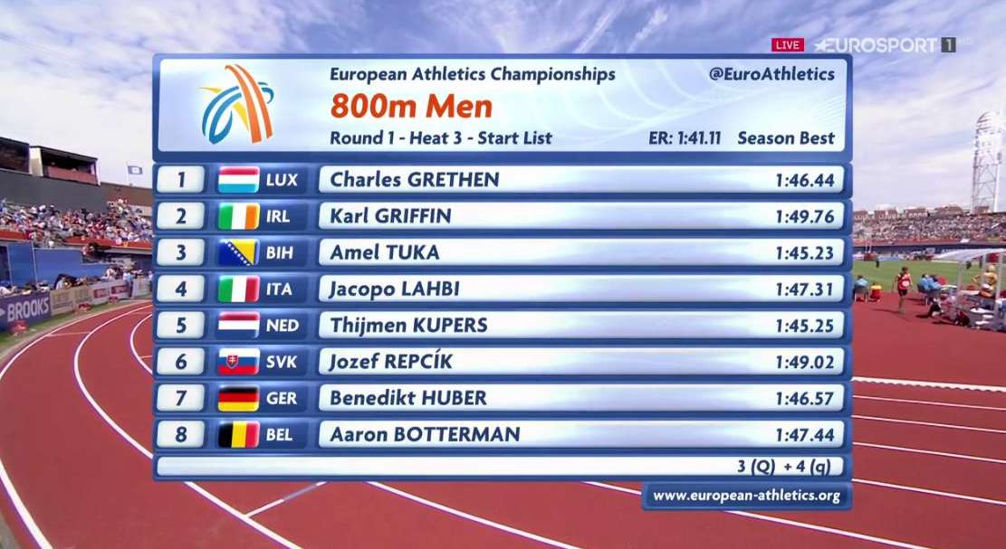 Tuka drugi u 3.kvalifikacionoj grupi na 800 metara na EP u Amsterdamu – Drugi bh. predstavnik na Evropskom prvenstvu, Amel Tuka nastupio je danas u trećoj kvalifikacionoj grupi trke na 800m.