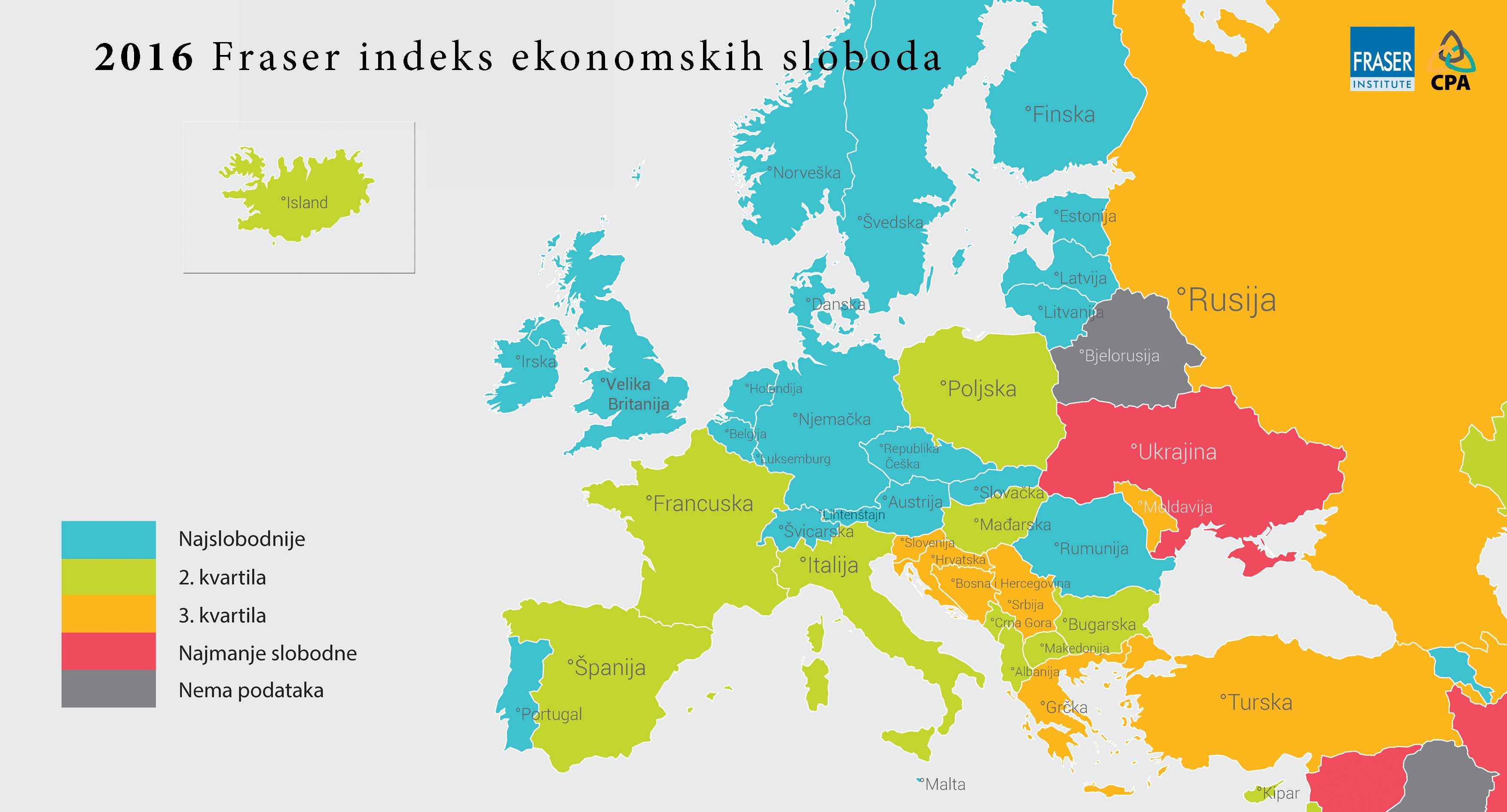 Fraser Institute & CPA: BiH ne uspijeva da skine okove sa ruku svojih građana – BiH se nalazi na 91. poziciji od ukupno 158 država i Hong Konga koje su obuhvaćene u izvještaju Ekonomske slobode širom svijeta: 2016 – Godišnji izvještaj, koji je objavljen danas od strane Centra za poslovnu afirmaciju (CPA) u saradnji sa Fraser Institutom iz Kanade.
