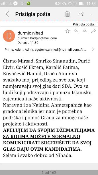 Na adrese velikog broja vjerskih službenika i vjernika u Zenici, proteklih dana stigle su na stotine e-mail poruka čiji je autor Nihad Durmić, sekretar Medžlisa islamske zajednice Zenica. Ovaj službenik uzeo je sebi za pravo da poziva svoje kolege iz MIZ Zenica i, kako navodi, džematlije, da glasaju za kandidate SDA. Ovom prilikom molim uvažene, muftiju zeničkog dr. Ejuba ef. Dautovića i glavnog imama Jakuba ef. Salkicu da se izjasne po pitanju poziva kojeg vjerskim službenicima i džematlijama šalje gore pomenuti Nihad Durmić.