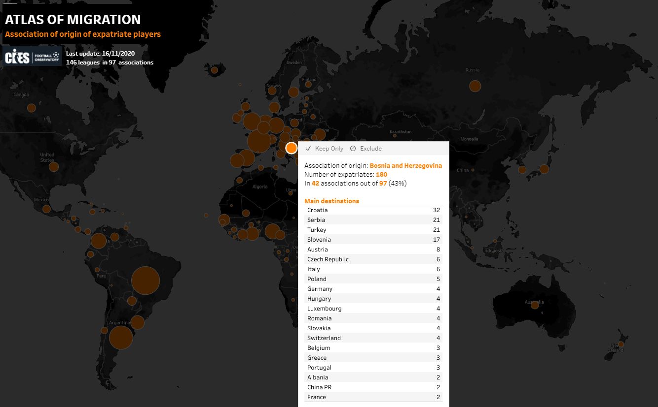 Bh. fudbaleri nastupaju čak u 42 od ukupno 97 asocijacija koje su se našle u ovom istraživanju CIES-a, a u nastavku pogledajte spisak svih zemalja u kojoj nastupaju bh. fudbaleri: