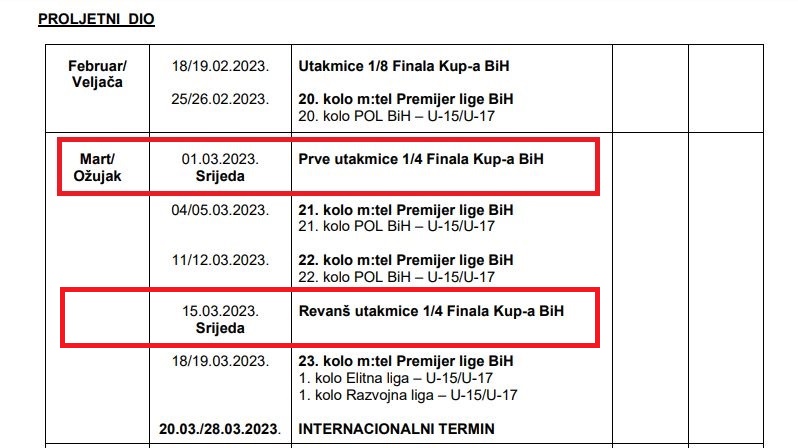 Prema kalendaru takmičenja, koji je usvojio Izvršni odbor FSBiH, prvi susreti u borbi za polufinale su zakazani za 1. mart (srijeda), odnosno Dan nezavisnosti Bosne i Hercegovine, a revanši su dvije sedmice kasnije (15. marta).