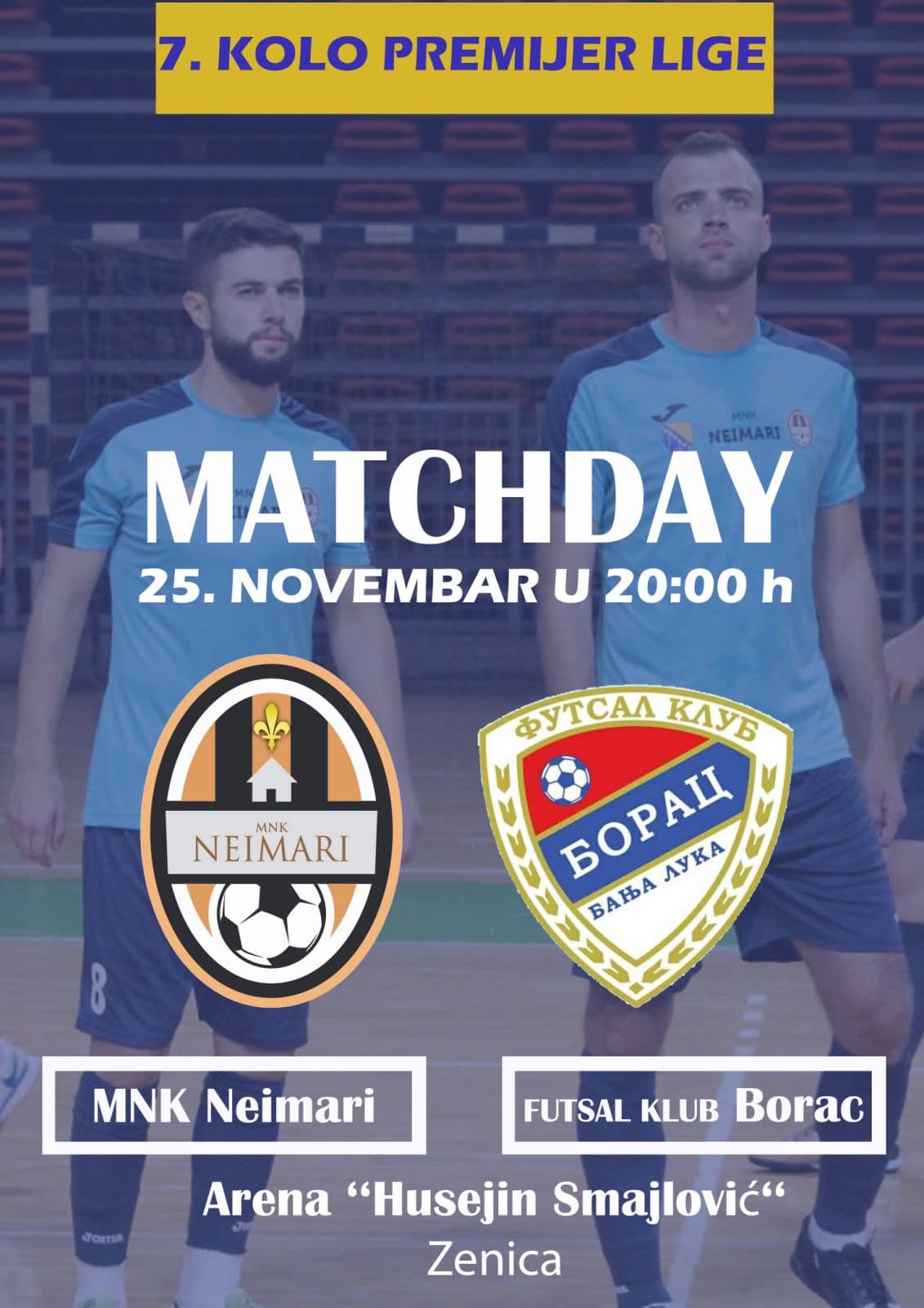 Utakmica 7. kola Premijer futsal lige BiH, MNK Salines-Neimari – FK Borac igra se u subotu 25. novembra u gradskoj Areni „Husejin Smajlović“ sa početkom u 20 sati.