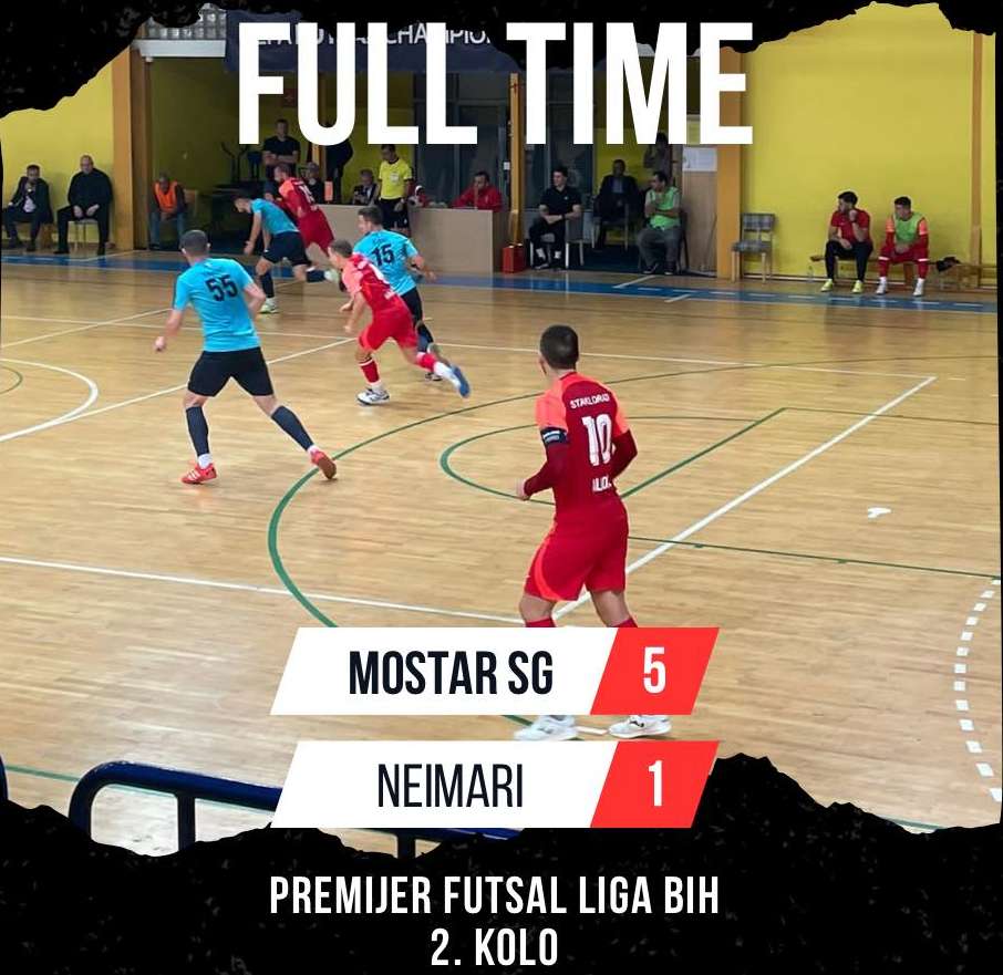 U 2. kolu Premijer lige BiH u futsalu malonogometni klub (MNK) „Salines-Neimari“ Zenica gostovao je u Mostaru kod ekipe FC „Mostar SG“. Utakmica je odigrana u USRC „Midhat Hujdur-Hujka“ od 19 sati pred oko 200 gledalaca. Ulogu favorita opravdala je domaća ekipa, viceprvak BiH, te ostvarila sigurnu i zasluženu pobjedu.
