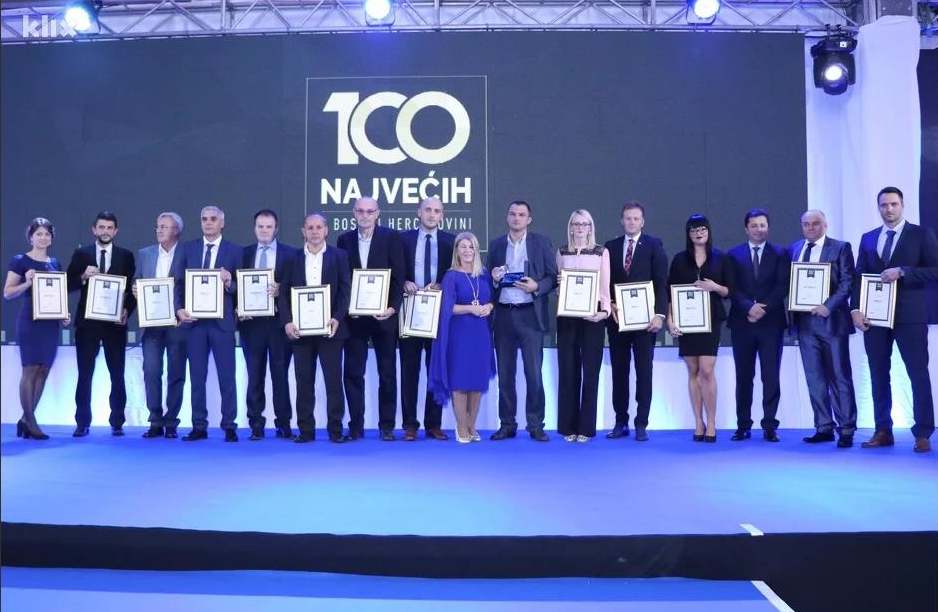 U kategoriji velikih kompanija priznanje “100 najvećih u privredi BiH” uručeno je za JP Elektroprivredu BiH sa 997.870.238 KM prihoda, BH Telecomu sa 83.588.626 KM dobiti te Preventu BH Visoko sa 320.529.230 KM izvoza.