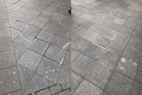 Jedini ispravan način da se ploče trajno postave jeste komplet vađenje granitnih ploča i postavljanje istih mokrim postupkom u estrihu koji je spravljen na ispravan način ( kvalitetne frakcije, propisana količina cementa i vode). Nakom postavljanja i ravnjanja estriha isti politi cementnim mlijekom ili još bolje vodootpornim i za vanjsku upotrebu lepilom i onda postvljati granitne ploče. Granitne ploče postavljene na ovaj način vječno će služiti svojoj funkciji.