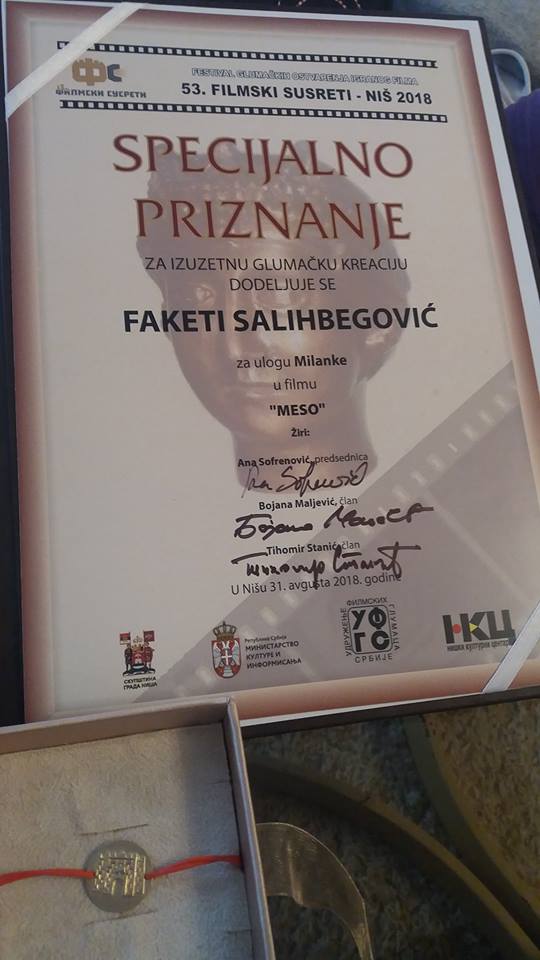Višestruko nagrađivana glumica Bosanskog narodnog pozorišta Zenica Faketa Salihbegović-Avdagić je osvojila Specijalno priznanje na 53. festivalu glumačkih ostvarenja igranog filma „Filmski susreti Niš“ za ulogu dementne majke u filmu „Meso“, režisera Saše Hajdukovića i scenariste Nikole Pejakovića, koja je dodijeljena na samom zatvaranju, 31. avgusta na Ljetnoj pozornici Niške tvrđave. Nagrade na 53. festivalu „Filmski susreti Niš“ je dodijelio Stručni žiri koji je radio u sastavu: glumica Ana Sofrenović, glumica Bojana Maljević i glumac Tihomir Stanić.