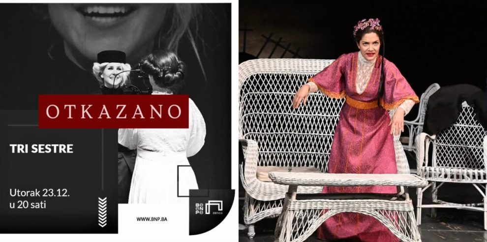 Bosansko narodno pozorište danas je obavjestilo svoje gledaoce da “zbog povrede glumice iz ansambla predstave, prinuđeno otkazati narednu izvedbu predstave “Tri sestre”, zakazanu za utorak, 23. decembar”.