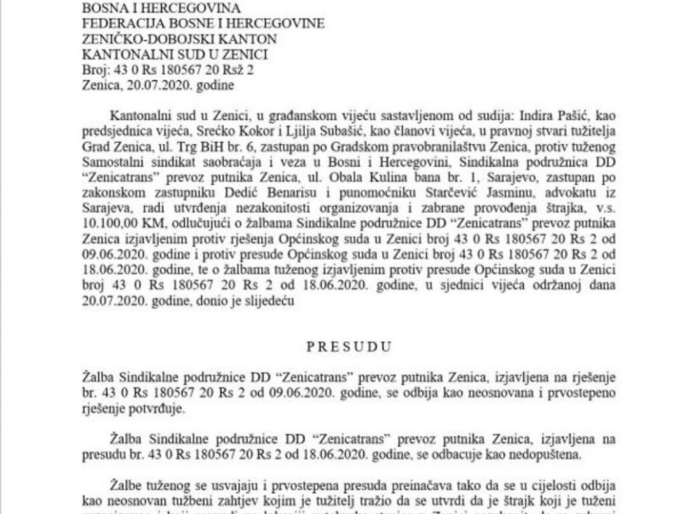 Grad Zenica izgubio spor kojim je tražio prekid štrajka radnika Zenicatransa – Vrhovni sud Federacije BiH odbacio je zahtjev Grada Zenica za Reviziju presude Kantonalnog suda u Zenici od 20. jula 2020. godine kojom je poništena i preinačena presuda Općinskog suda u Zenici.
