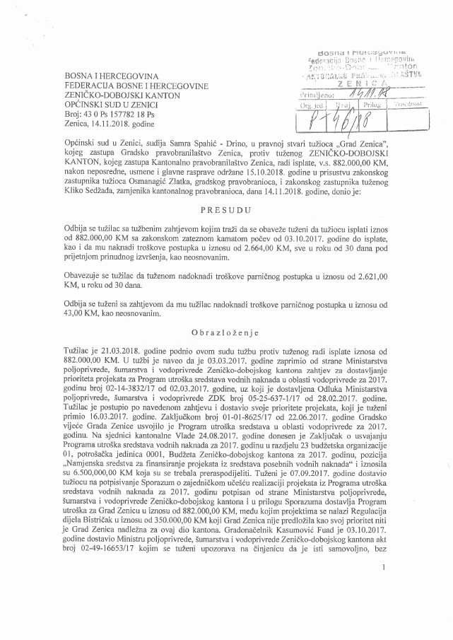 Gradsko pravobranilaštvo Zenica, kao zastupnik Grada Zenice, podnijelo je u martu prošle godine tužbu protiv Zeničko-dobojskog kantona, radi isplate iznosa od 882.000,00 KM, smatrajući da je za navedeni iznos Grad oštećen prilikom raspodjele sredstava vodnih naknada za 2017. godinu.