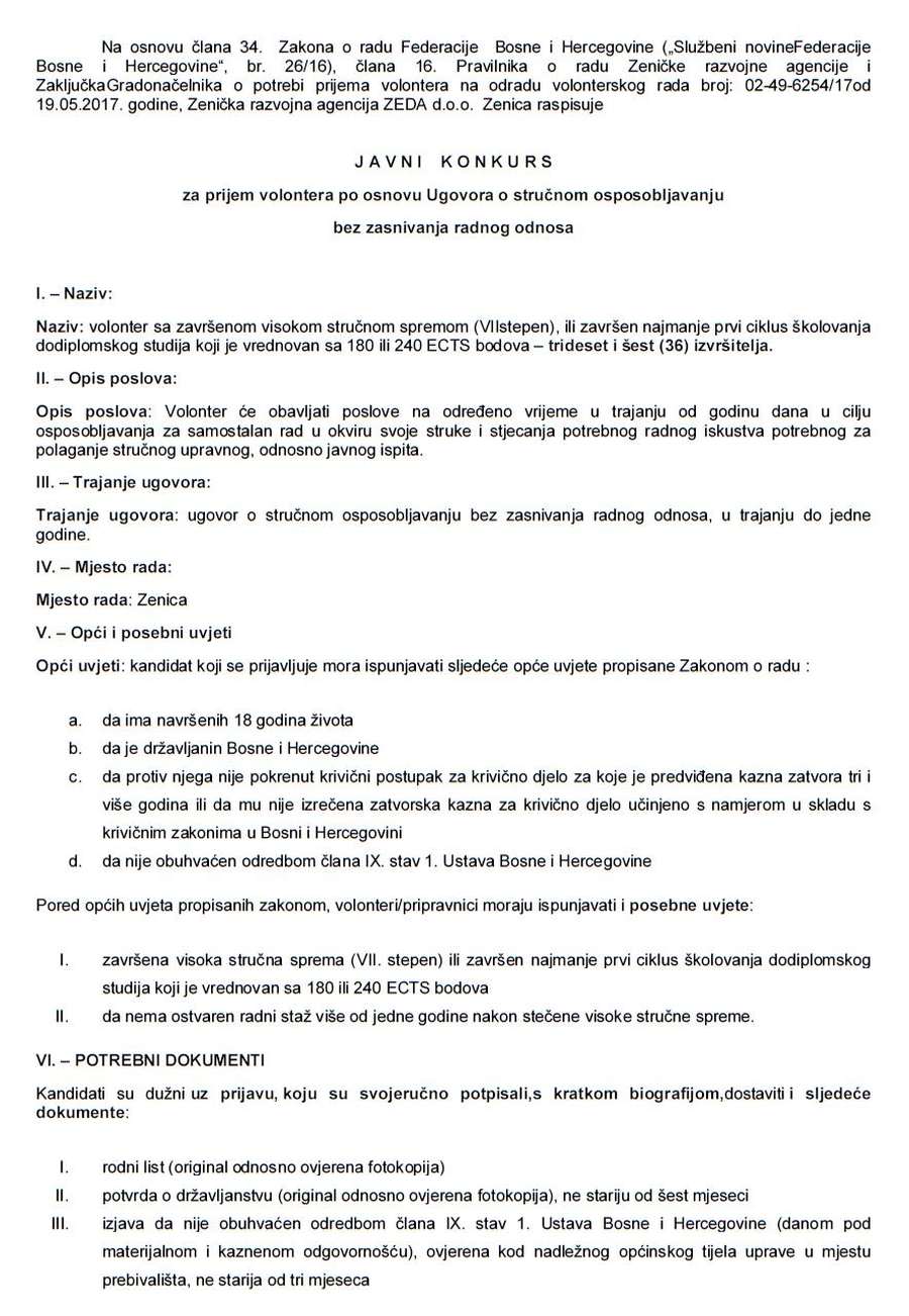 Grad Zenica: Javni poziv za prijem volontera u Agenciji ZEDA – Na web stranici Grada Zenica objavljen je javni konkurs za prijem volontera po osnovu Ugovora o stručnom osposobljavanju bez zasnivanja radnog odnosa. Na konkur se mogu prijaviti zainteresovani sa završenom visokom stručnom spremom (VIIstepen), ili završenim najmanje prvim ciklusom školovanja.