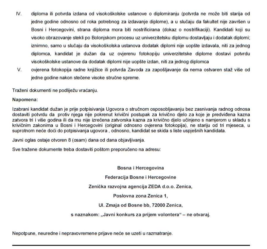 Kandidat koji se prijavljuje mora ispunjavati opće i posebne uvjete navedene u konkursu. Javni oglas ostaje otvoren 8 dana od dana objavljivanja a sve tražene dokumente treba dostaviti poštom preporučeno na adresu Zeničke razvojne agencije Zeda.