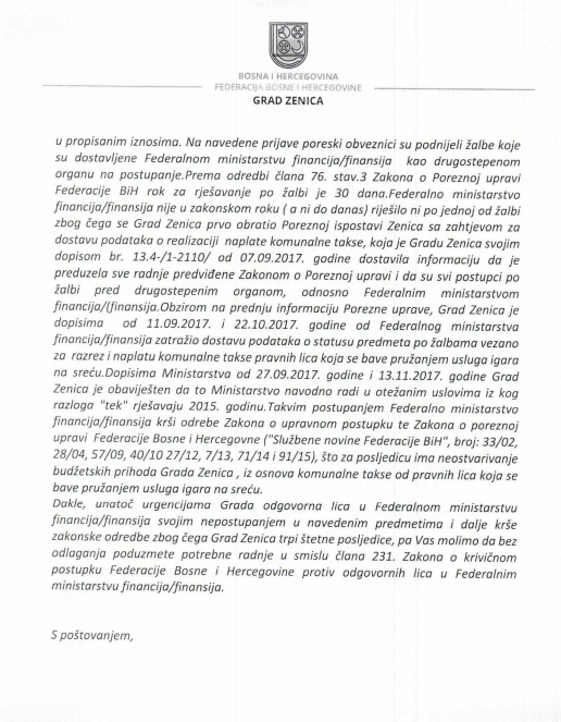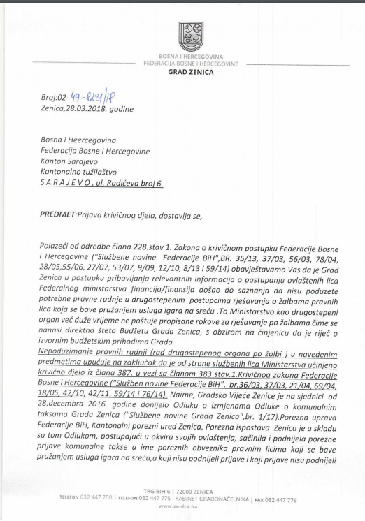 Grad Zenica podnio krivičnu prijavu protiv odgovornih u Ministarstvu finansija FBiH – Kabinet gradonačelnika Zenice Fuada Kasumovića dostavio je Kantonalnom tužilaštvu Kantona Sarajevo prijavu krivičnog djela protiv odgovornih lica u Federalnom ministarstvu finansija. Naime, Grad Zenica je u postupku pribavljanja relevantnih informacija o postupanju ovlaštenih lica Federalnog ministarstva finansija došao do saznanja da nisu poduzete potrebne pravne radnje u drugostepenim postupcima rješavanja o žalbama pravnih lica koja se bave pružanjem usluga igara na sreću. Ministarstvo finansija FBiH kao drugostepeni organ duže vrijeme ne poštuje propisane rokove za rješavanje po žalbama, čime se nanosi direktna šteta Budžetu Grada Zenica, s obzirom da je riječ o izvornim budžetskim prihodima Grada Zenica.