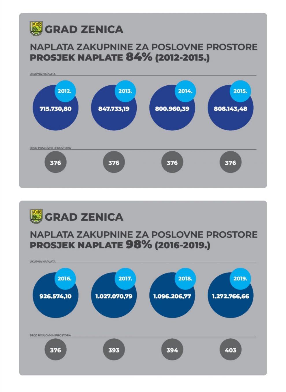 Grad Zenica u 2019. godini naplatio rekordan iznos sredstava po osnovu zakupnine za poslovne prostore – Otkako su prije tri godine uređene procedure i kriteriji davanja u zakup poslovnih prostora u vlasništvu i na upravljanju Grada Zenica, prosjek naplate zakupnine dosegao je cifru od 98%, što je za 14% više nego u periodu od 2012. do 2015. godine.