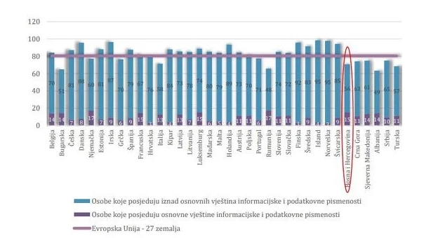 Analiza je pokazala kako 5,35 posto stanovništva BiH ima digitalne vještine iznad osnovnog nivoa. To sugeriše da oni premašuju temeljne kompetencije potrebne za digitalnu pismenost.