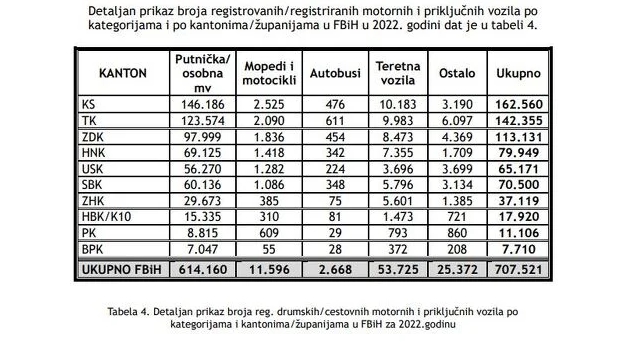 Najviše registrovanih vozila (162.560) je u Kantonu Sarajevo što je povećanje za 2,64 posto u odnosu na 2021. godinu, a najmanje registrovanih vozila je u BPK (7.710). Zanimljivo je da u Federaciji BiH svi kantoni bilježe porast broja registracija, u rasponu od 1,5 do 3 posto.