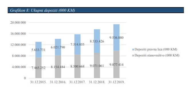 Od ukupnog iznosa, depoziti stanovništva iznose 9,9 milijardi maraka, dok su depoziti pravnih lica oko 9,5 milijardi, piše Biznisinfo. Samo u prošloj godini depoziti stanovništva porasli su za skoro milijardu KM, jer su na kraju 2018. iznosili devet milijardi.