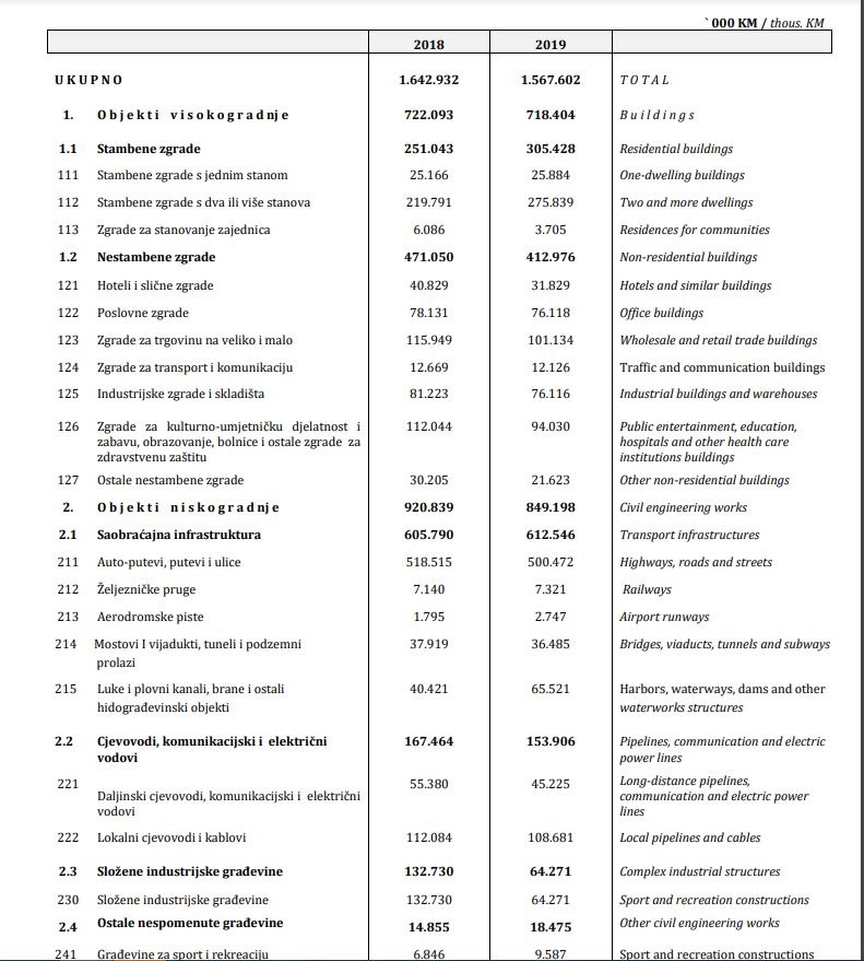 ” U 2019. završene su 352 zgrade od strane pravnih subjekata, od toga je 48,0% stambenih zgrada i 52,0% nestambenih zgrada. Površina završenih zgrada je 577.238 m², što je za 8,6% više nego u 2018. godini. Broj završenih stanova u 2019. godini iznosi 3.020, što predstavlja povećanje od 1,2% u odnosu na 2018. godinu“, stoji, između ostalog, u ovom Izvještaju.