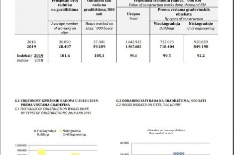 Tako je prosječan broj radnika na gradilištima angažovanih od strane pravnih subjekta bio – 20.407, što je za 1,6 posto više u odnosu na 2018., dok je broj odrađenih sati rada na gradilištima veći za 5,1 posto u odnosu na prethodnu godinu.