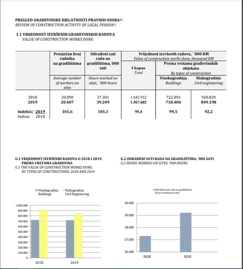 Međutim, vrijednost izvršenih građevinskih radova u Bosni i Hercegovini koje su izvršili radnici na gradilištima u 2019. manja je za 4,6% u odnosu na 2018. godinu.