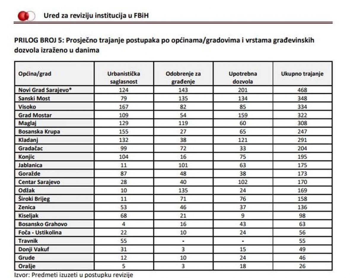 Također, revizori su u izvještaju zaključili i kako je u pojedinim slučajevima efikasnije i lakše dobiti legalizaciju bespravno izgrađenog objekta, nego građevinsku dozvolu u redovitoj proceduri. Tako u pojedinim općinama objekt možete legalizirati za devet dana, a urbanističku saglasnost za 158 dana, što je nepojmljivo.