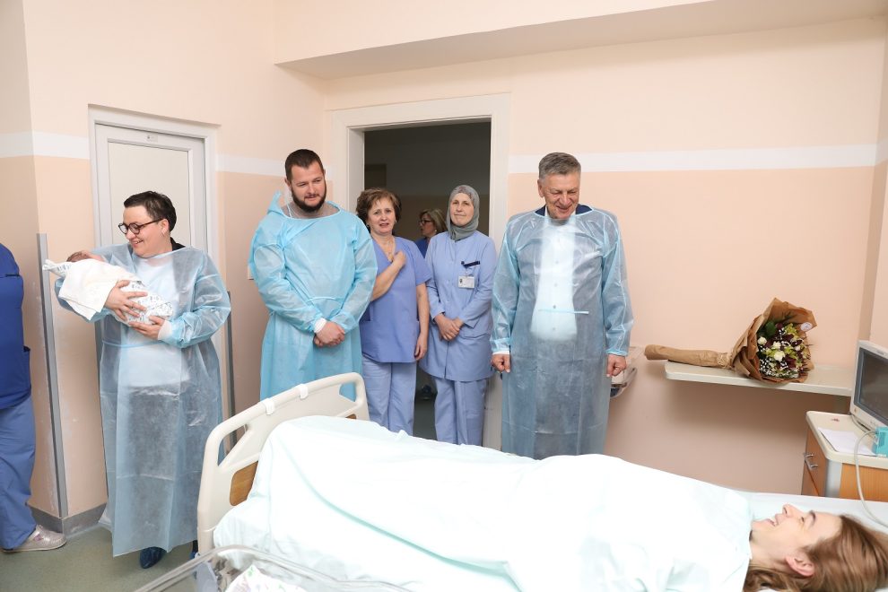 Gradonačelnik Zenice Fuad Kasumović sa saradnicima posjetio je danas Kantonalnu bolnicu Zenica gdje darovao bebu koja je prva rođena na Dan Zenice u 2023. godini.