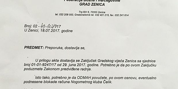 Gradonačelnik traži da uprave, odnosno nadzorni odbori poduzmu Zakonom predviđene radnje i da odmah povuku eventualno podnesene blokade računa Nogometnog kluba Čelik. Preporuka Gradonačelnika i Gradskog vijeća je da se sagleda mogućnost otpisa dugovanja koja NK Čelik ima prema gradskim javnim preduzećima i to u ukupnom iznosu 2.664.200 KM. Na ovaj način stvorili bi se uslovi da jedan od simbola grada krene u proces ozdravljenja.
