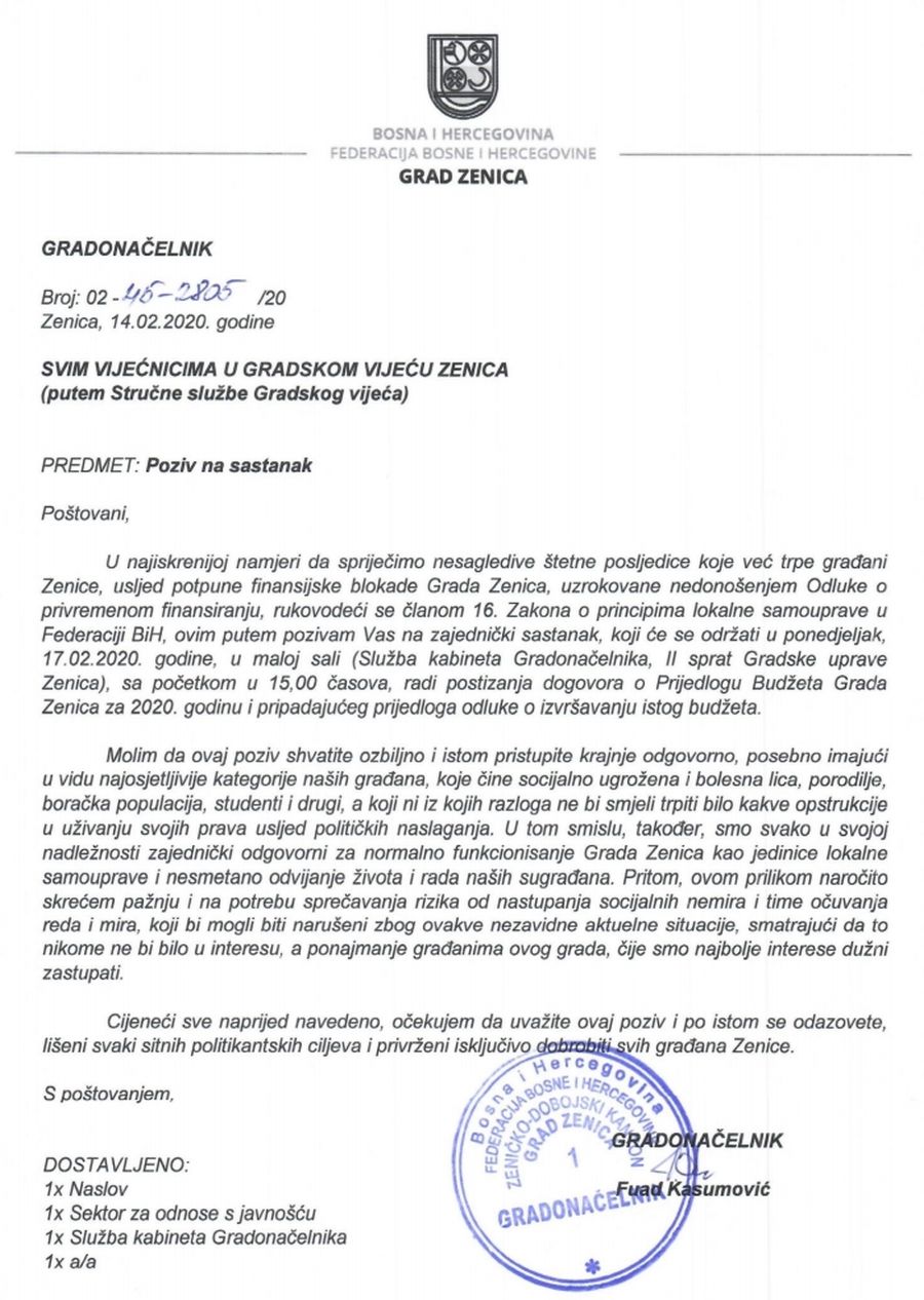 Iz kabineta gradonačelnika medijima je upućen poziv koji je naslovljen na sve vijećnike od strane gradonačelnika Zenice g. Fuada Kasumovića. Prenosimo poziv: