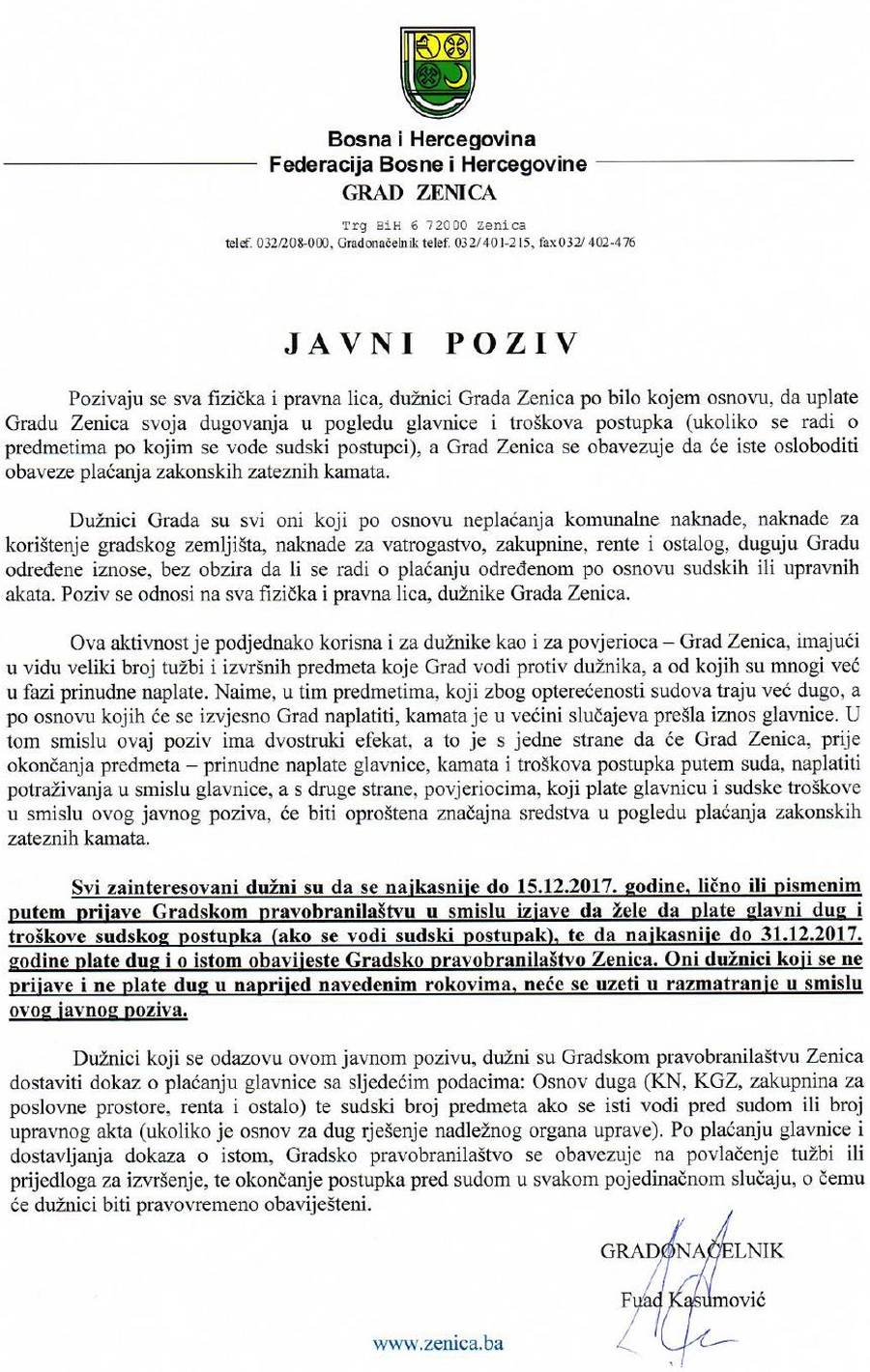 U slučaju javljanja Gradskom pravobranilaštvu, najkasnije do 15. decembra, dužnici će biti oslobođeni obaveze plaćanja zakonskih zateznih kamata. Preciznije o ovom javnom pozivu možete pročitati ovdje: