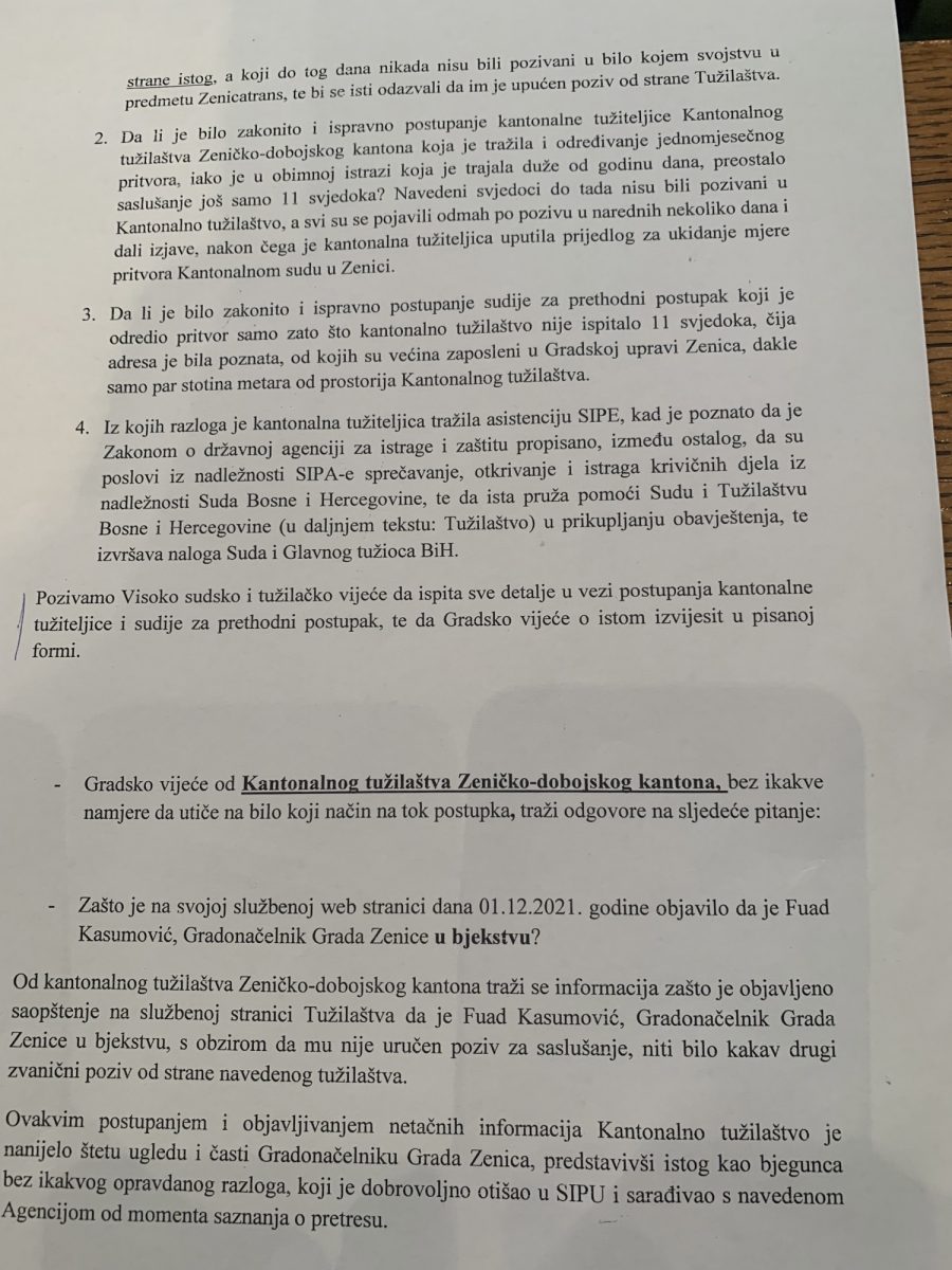 Navodi se i to da je Kantonalno tužiteljstvo nanijelo ovakvim postupanjem štetu ugledu i časti gradonačelniku Zenice, predstavivši ga kao bjegunca bez opravdanog razloga, iako je, kako se navodi, dobrovoljno otišao u SIPA-u.