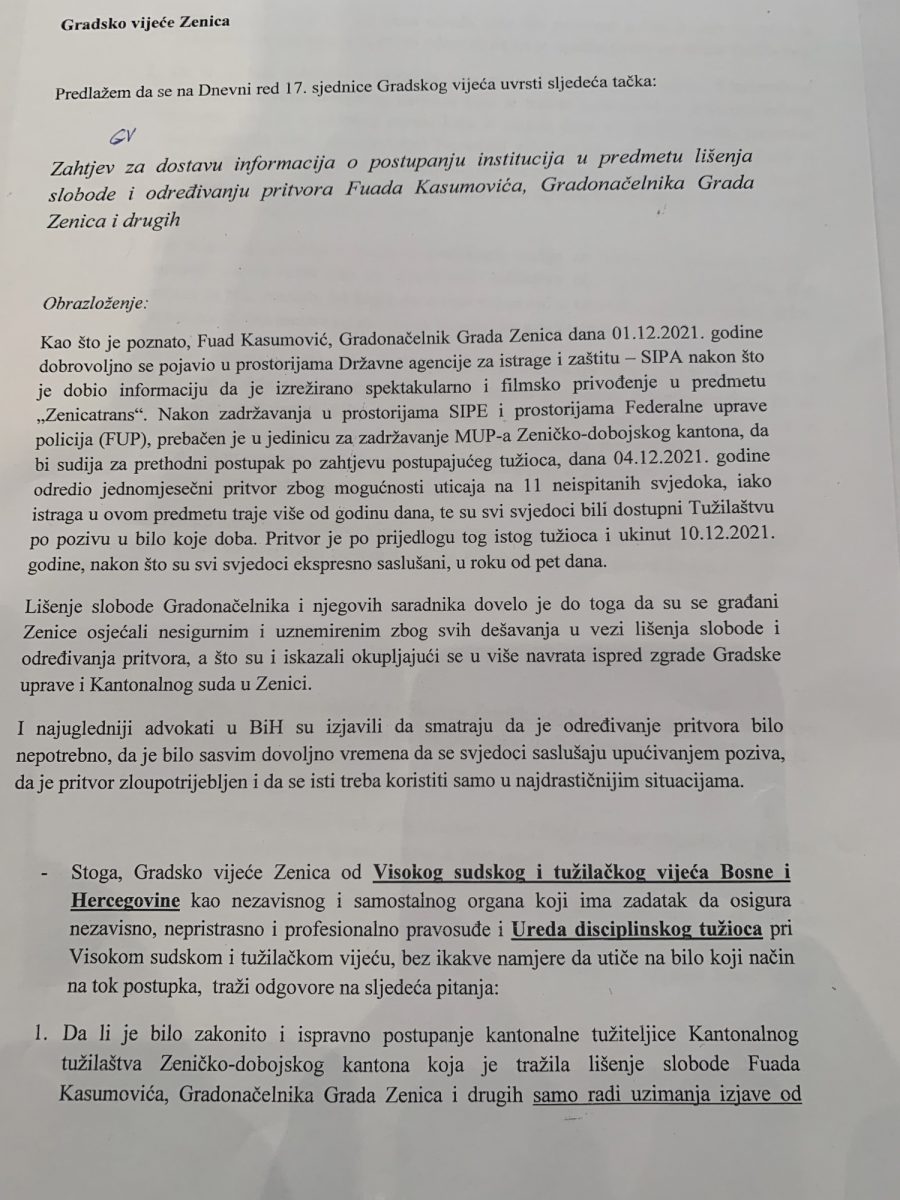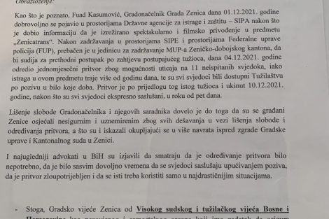 Gradsko vijeće Zenica s 18 glasova za podržalo je Zahtjev u kojem se traži od institucija da dostave informacije o lišenju slobode i određivanja pritvora gradonačelniku Fuadu Kasumoviću.